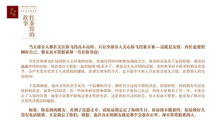 這就是《紅茶館》的由來,讓我們一起繼續(xù)編寫《紅茶館》的故事。自然而然想起你的自然泉團(tuán)隊(duì)是一群有理想的年輕人。我們希望通過我們的所作所為,能喚起人與人之間的感情,能溫暖那些不曾常聯(lián)系的人。