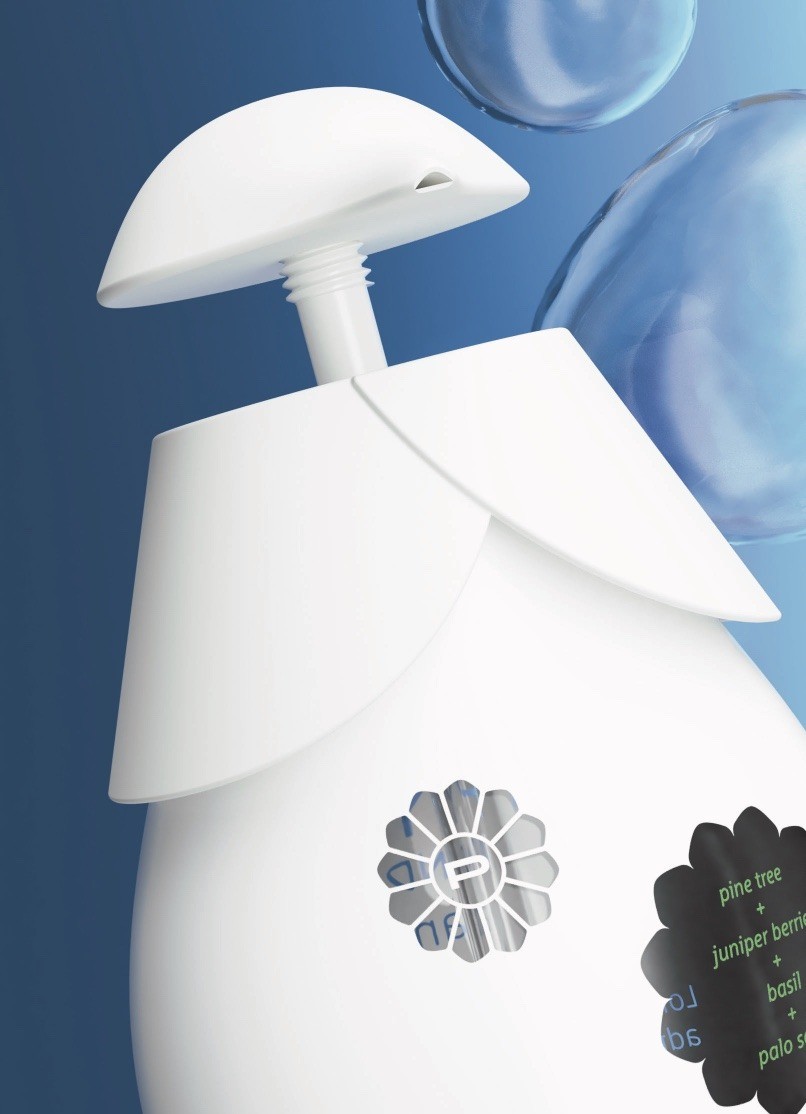 通過使用場(chǎng)景可以觀察到轉(zhuǎn)化為我的設(shè)計(jì)的松果的特性。每一瓶派恩洗手液都有一個(gè)“補(bǔ)充種子”,一個(gè)由雞蛋盒狀的再生紙制成的小袋,里面裝滿了粉末狀的洗手液。然后,用戶將粉末倒入瓶中,就像松果的鱗片將水輸送到莖部一樣,將粉末與水混合,在家中制作產(chǎn)品。這節(jié)省了運(yùn)輸重液體洗漱用品的成本和碳足跡。補(bǔ)充種子也可以單獨(dú)購(gòu)買12粒種子的光盤,類似于派恩標(biāo)志。材料和形式創(chuàng)造了一個(gè)獨(dú)特和可持續(xù)的品牌機(jī)會(huì),因?yàn)榉N子可以用徽標(biāo)壓花,而不需要墨水打印,同時(shí)所需的法律信息可以包含在單個(gè)中央標(biāo)簽上。此外,光盤可堆疊,從而節(jié)省貨架空間。填充種子的整體設(shè)計(jì)在不同的變體中相似,只是顏色和標(biāo)簽設(shè)計(jì)不同。另一個(gè)常見的部件是蓋和泵系統(tǒng)。形狀相似,表面處理和顏色略有變化,降低了模具成本,因?yàn)橥荒>呖膳c不同的顏料顆粒重復(fù)使用。設(shè)計(jì)語(yǔ)言應(yīng)該散發(fā)出保護(hù)的感覺,瓶蓋幾乎包裹著瓶子,因?yàn)樗潭ㄔ谄款i上。將泵固定在瓶子上的螺旋運(yùn)動(dòng)也模仿了松果的分形結(jié)構(gòu),從上到下螺旋運(yùn)動(dòng)。致動(dòng)器為圓頂形,除了確保符合人體工程學(xué)的設(shè)計(jì)外,還將產(chǎn)品與競(jìng)爭(zhēng)對(duì)手區(qū)分開來,因?yàn)樵谙词职b設(shè)計(jì)中,分配器泵作為一個(gè)獨(dú)特的功能經(jīng)常被忽略。每種派恩洗手液有兩種尺寸:350毫升和700毫升