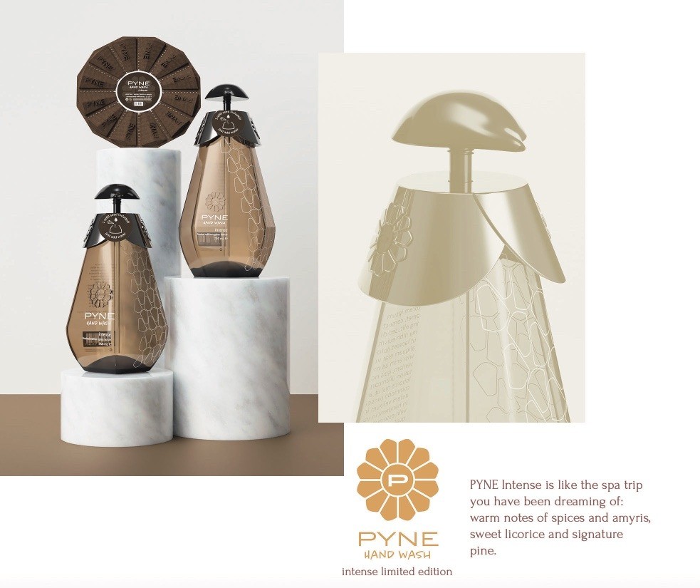 我的概念是從創(chuàng)建一個(gè)品牌開始的。我知道我會(huì)參考松果的設(shè)計(jì),所以我希望整個(gè)品牌都與松樹有關(guān)。在我的仿生書中,用審美選擇暗示主題是可以的,只要它是為了建立品牌的背景,并且一切都與作為最終產(chǎn)品呈現(xiàn)的具有凝聚力的故事的消費(fèi)者相關(guān)。我為PYNE洗手液產(chǎn)品線提供的三種變體制作了三種香水配置文件。三者都以松樹作為共同的音符,創(chuàng)造了一致的嗅覺品牌標(biāo)識(shí)。派恩洗手液是原版的主要變體;它有一個(gè)標(biāo)志性的,泥土的,平衡的特點(diǎn)與廣藿香,松子,檀香木的額外注意。原作是一款即時(shí)經(jīng)典,給人一種優(yōu)雅的感覺。這些品質(zhì)也體現(xiàn)在包裝設(shè)計(jì)中:在長(zhǎng)方形瓶身上有一個(gè)柔和的調(diào)色板,帶有米色和深綠色。派恩洗手液antibac有一個(gè)泡沫,脆,明亮的個(gè)性與杜松漿果,羅勒,和帕洛桑托作為補(bǔ)充說明??箟难嶙兎N讓人想起在溫暖的夏天喝杜松子酒補(bǔ)品,因?yàn)樗鼘⑿l(wèi)生與新鮮聯(lián)系在一起。瓶子的設(shè)計(jì)是球狀的,主要是白色,帶有藍(lán)色和綠色的色調(diào),窗戶可以窺視里面的洗手液。另一方面,PYNE hand Wash Intensive限量版則與之完全相反,添加了香料、甘草和苦杏仁,創(chuàng)造了一種美食家、深度和奢華的體驗(yàn)。這就像你夢(mèng)寐以求的水療之旅,裝在一個(gè)瓶子里,它有著多面的寶石般的形狀,由琥珀色的玻璃和白色印刷的圖形元素組成。