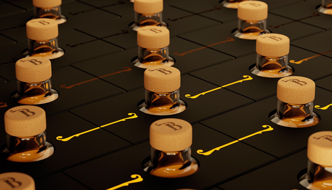 這種蜂蜜實(shí)際上有四種不同的類型;酸木、麥盧卡、橘子和蕎麥。為了使每一個(gè)都與眾不同,我們決定給它們可識(shí)別的顏色;青銅色、金色、銀色和翡翠綠色(按順序排列)搭配閃亮的紫外線,與前面蜜蜂烙印的黑色背景形成強(qiáng)烈對(duì)比,除了對(duì)這種生物的尊重之外,別無(wú)其他。
