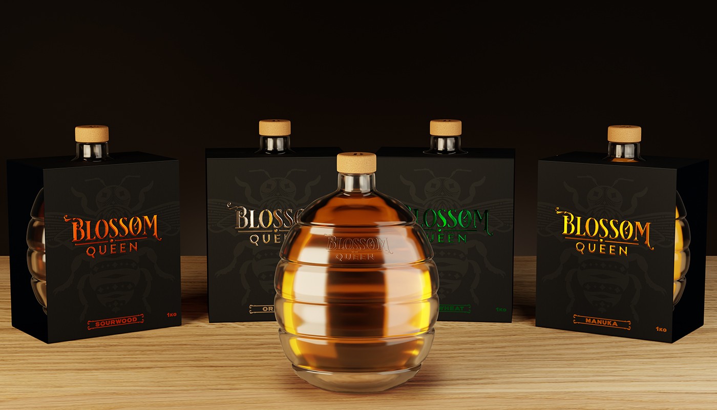 Blossom Queen是一個(gè)致力于為消費(fèi)者提供最優(yōu)質(zhì)蜂蜜的品牌,我們的使命就是從提到這個(gè)行業(yè)的重要組成部分“蜜蜂”開(kāi)始,為這個(gè)品牌建立一個(gè)標(biāo)識(shí),設(shè)計(jì)一瓶玻璃瓶,提醒每個(gè)人蜂蜜來(lái)自“蜂巢”,使其與市場(chǎng)上的任何瓶子或容器有所不同。最后用一個(gè)豪華的包裝把它包起來(lái),提供更多關(guān)于每個(gè)罐子里裝的東西的信息。