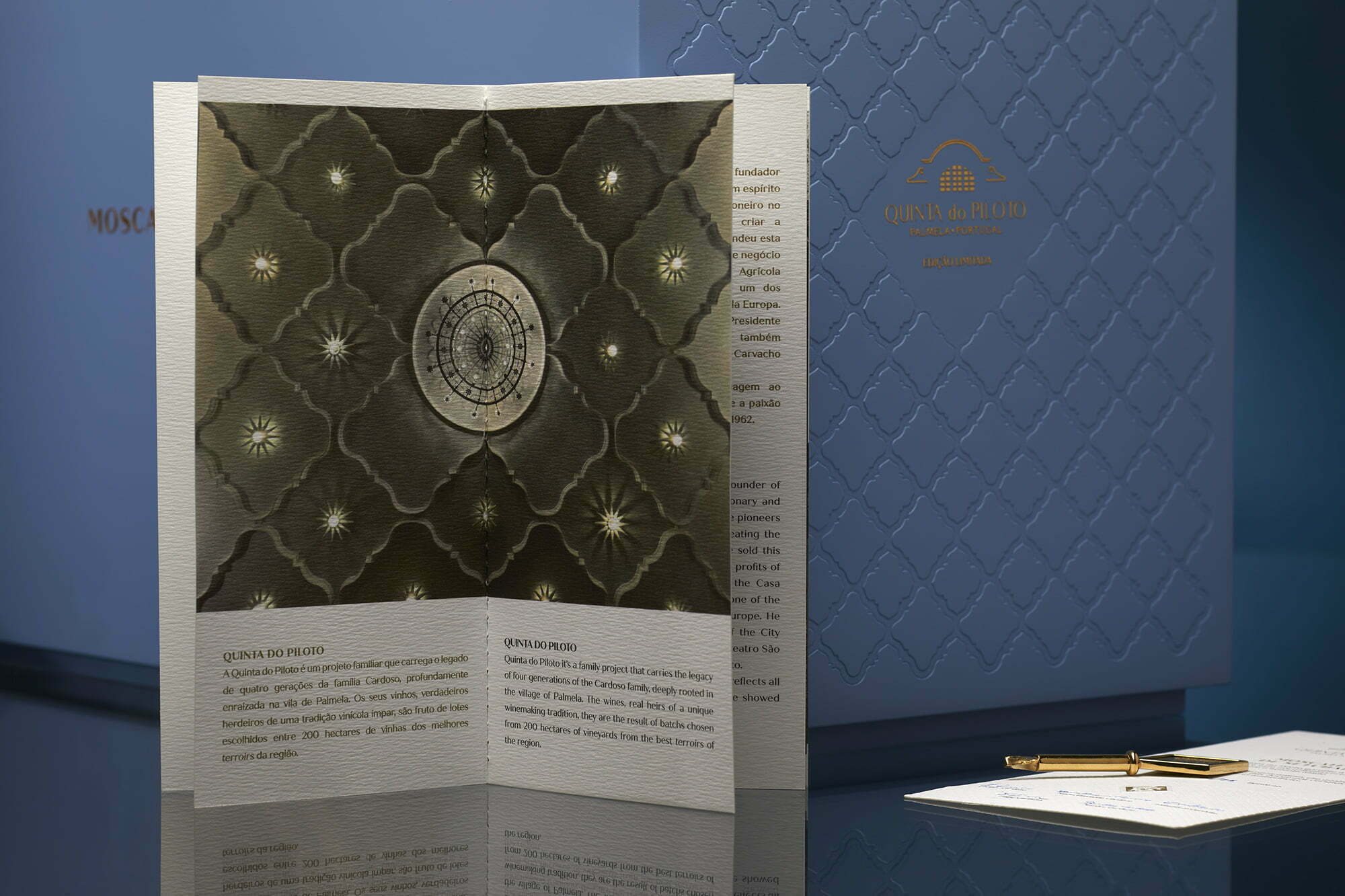 The colors chosen are distinct and, at the same time, identifying of the Quinta and of the region. Omdesign was inspired by an original bottle of Moscatel de Setúbal to create the exclusive decanter that is adorned with a collar and has several elements that refer to the cinema theatre in Palmela, built at the behest of Humberto da Silva Cardoso. We also used the monogram present on the gate of the cinema with the initials of the founder, we merged all the elements and we took the detail we have on the packaging and on the decanters to the original plaster ceiling of this emblematic room. These exclusive pieces were also completed with details of some tiles of the reception and the bartop has an interlacing which represents the tradition and the art of well-making these Moscatéis. This edition is, without a doubt, a homage to Quinta do Piloto and its founder, as well as to the region and to the Moscatel de Setúbal category.