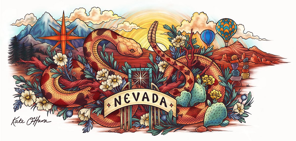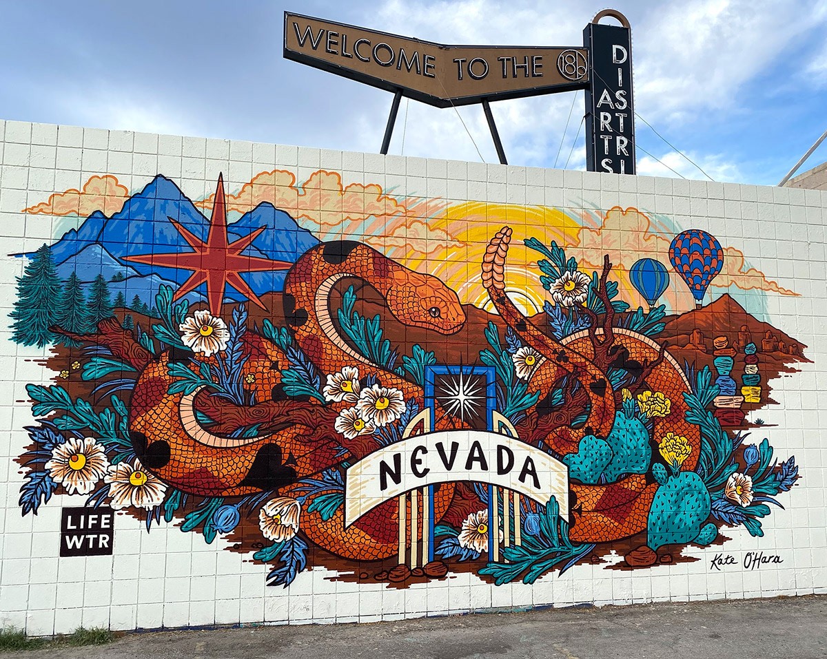 Kate O'Hara與 LIFEWTR 合作設(shè)計(jì)了一個(gè)代表她家鄉(xiāng)內(nèi)華達(dá)州及其對(duì)他有意義的水瓶。我們還根據(jù)瓶子的設(shè)計(jì)組合了一套不同的商品,包括頭巾、別針、貼片、貼紙和帽子。然后,他們聘請(qǐng)我根據(jù)瓶子設(shè)計(jì)繪制兩幅壁畫,一幅在里諾大學(xué),另一幅在拉斯維加斯藝術(shù)區(qū)。