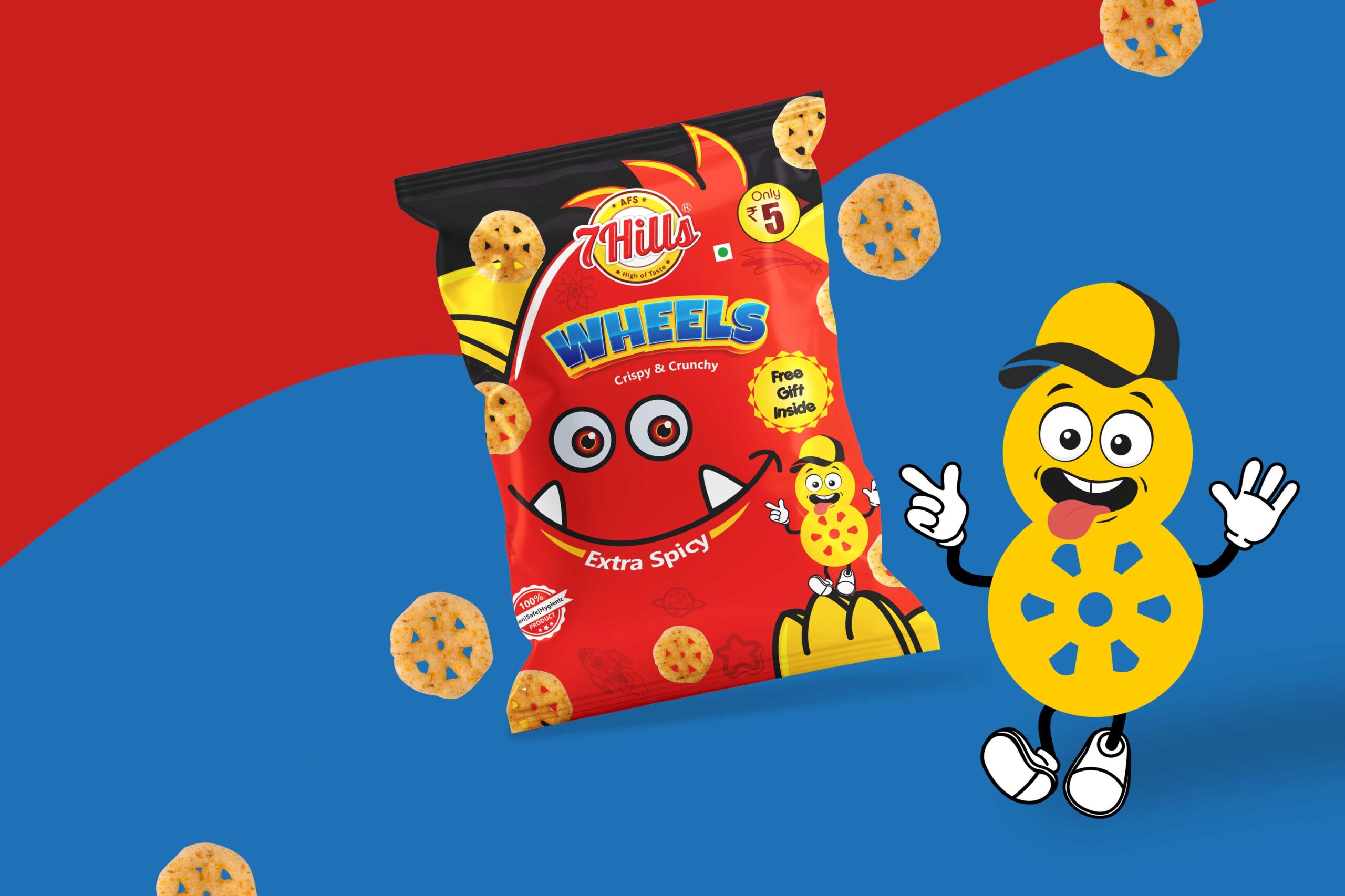 辛辣車輪:這款包裝的設(shè)計(jì)考慮了辛辣口味的脆車輪。包上的字符是一個(gè)有趣的輪子字符,由繪圖創(chuàng)建。這個(gè)設(shè)計(jì)的中心人物是紅色的。由于增加了有趣的角色,這些包對孩子們來說變得更具互動(dòng)性。