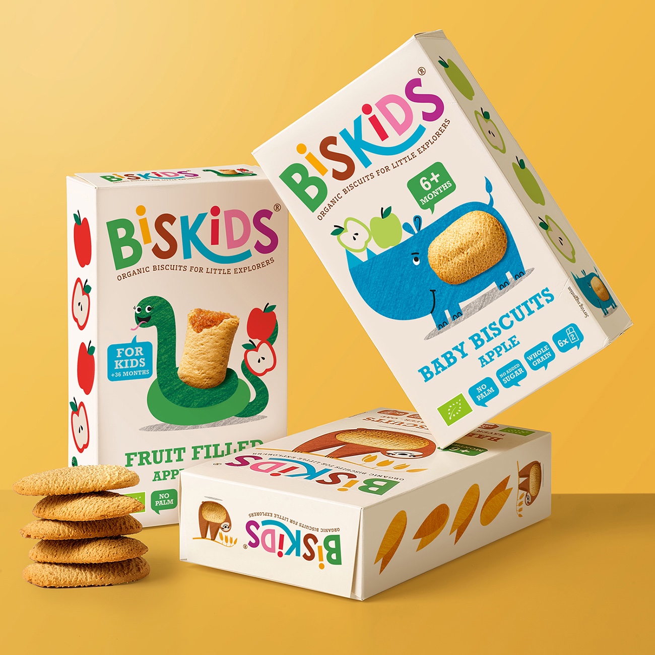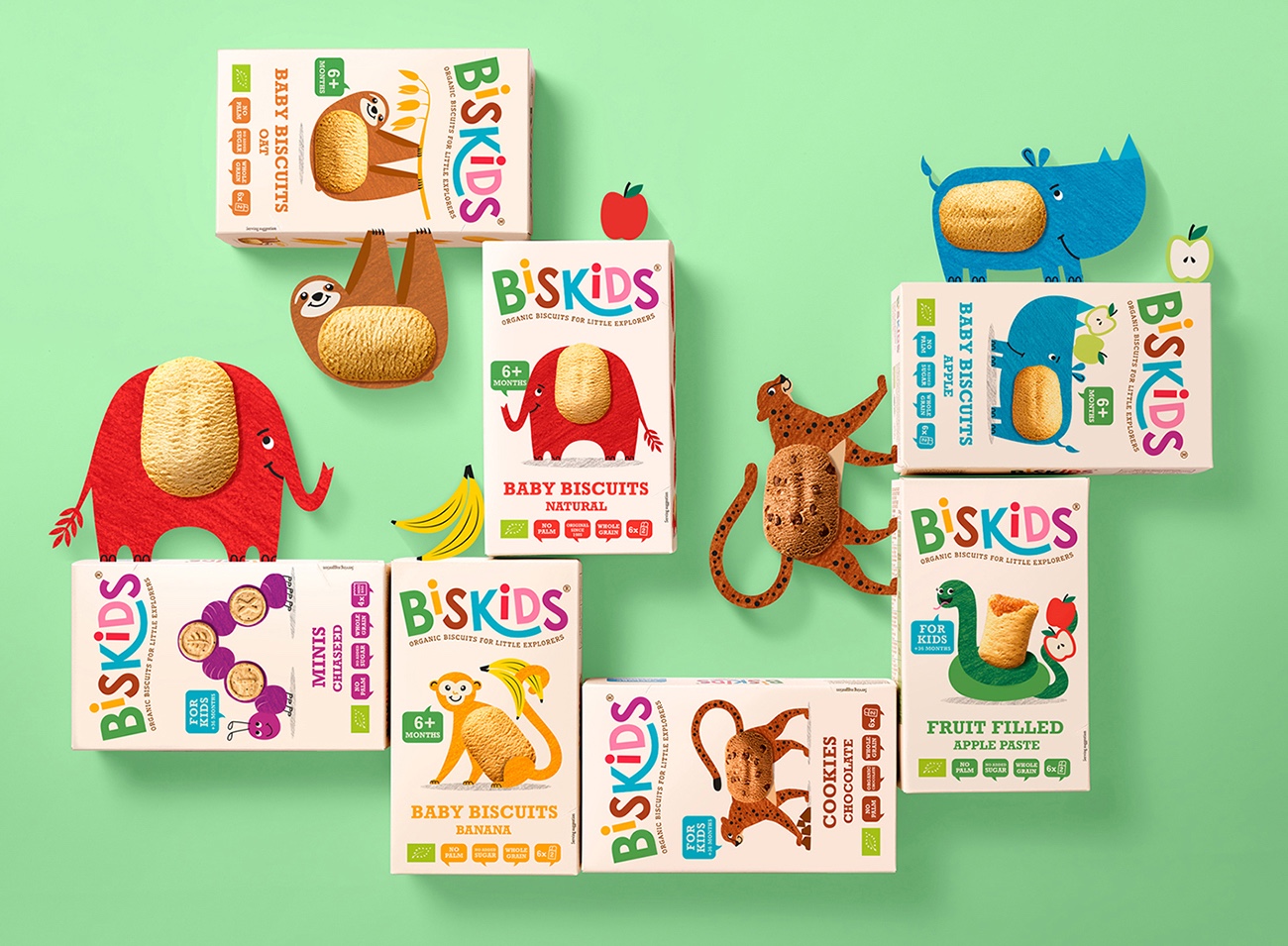 該品牌被徹底重新設(shè)計,以更好地傳達品牌的積極性和自然活力。我們還決定,要想贏得母親們的心,就要讓孩子們快樂,并通過創(chuàng)造一系列可愛的小動物來實現(xiàn)這一點,每一種動物都與餅干故事相結(jié)合,并快樂地給小臉蛋帶來微笑。除了這些可愛角色的可愛集合,我們還確保利益溝通清楚地讓品牌有理由相信,并引導媽媽們清楚地為孩子選擇合適的產(chǎn)品。