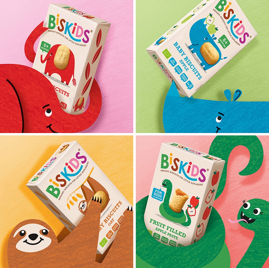 Quatre Mains兒童趣味零食包裝設(shè)計欣賞。Quatre Mains bakes Biskids to play with.