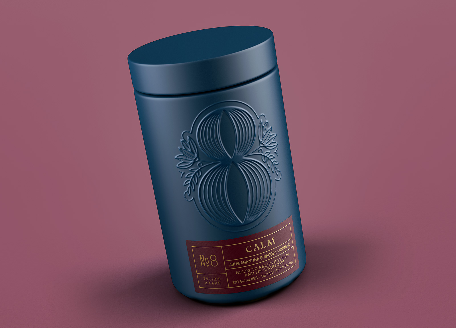 為了捕捉這種精神,我們創(chuàng)建了一個(gè)說(shuō)明性的數(shù)字 8 標(biāo)志作為品牌的核心。該標(biāo)記以植物元素和振幅線為特色,形象化了益智補(bǔ)充劑可以為健康和專(zhuān)注的生活方式帶來(lái)的好處。干凈的包裝采用帶有浮雕徽標(biāo)的粉末涂層玻璃罐,為這個(gè)高檔品牌增添了精致的感覺(jué)。