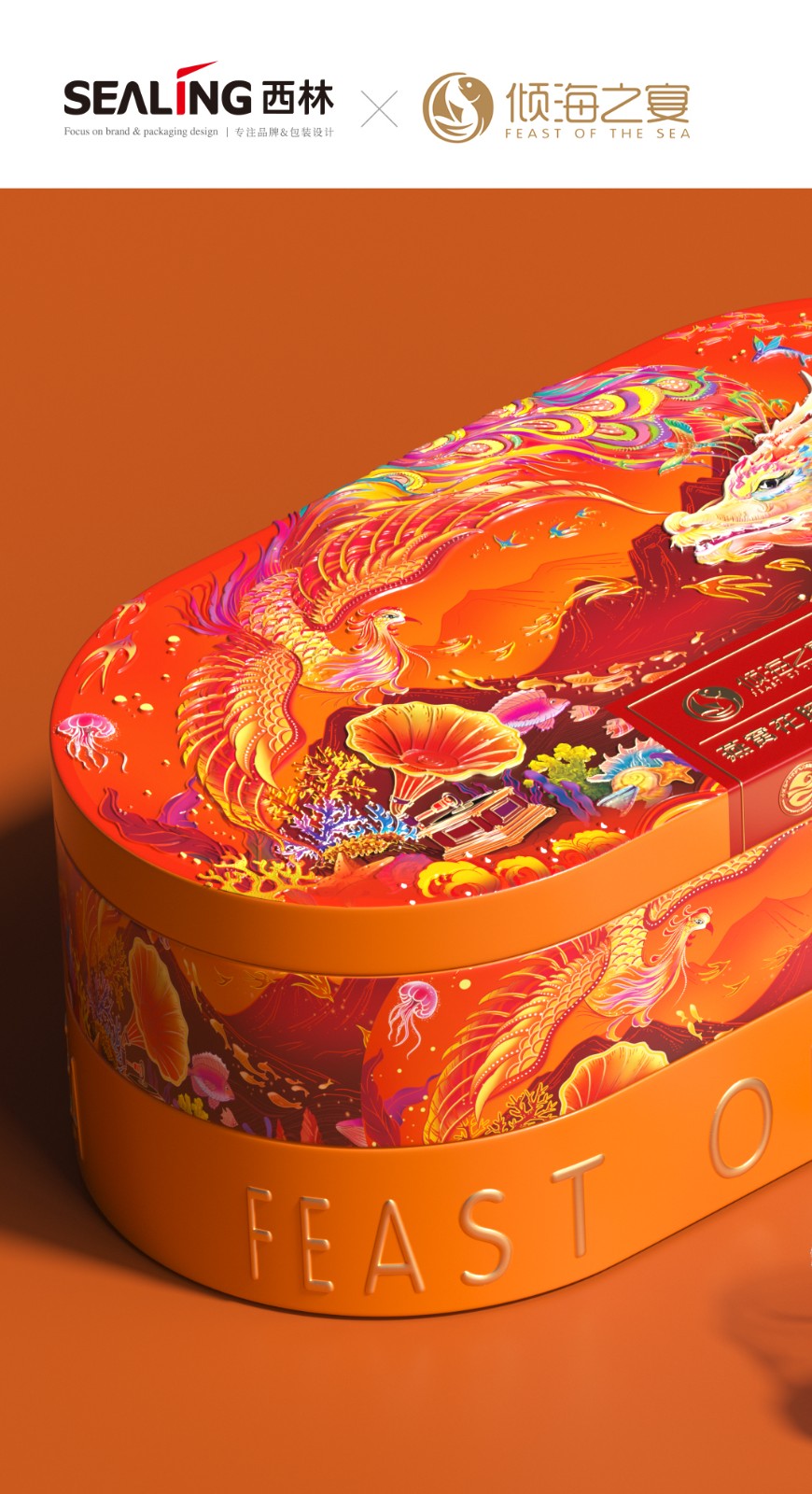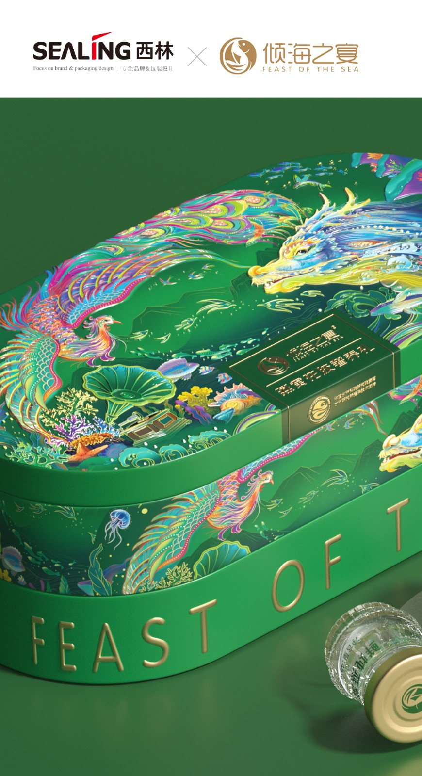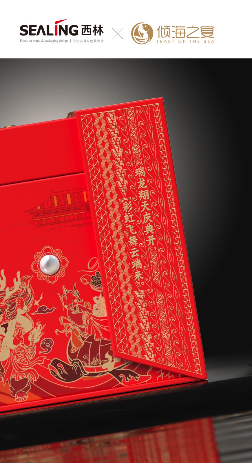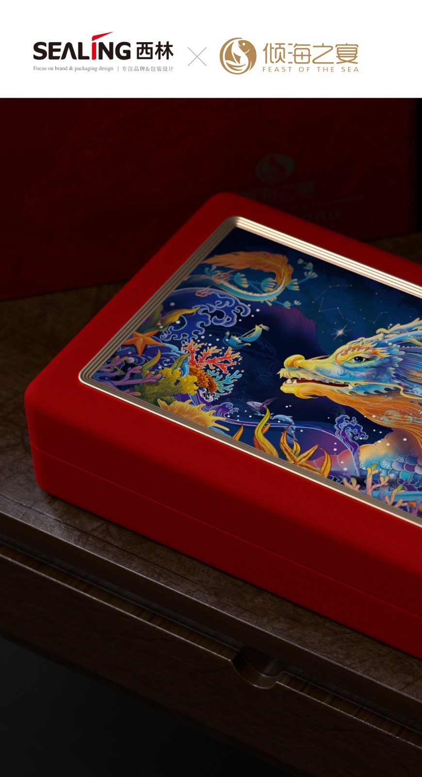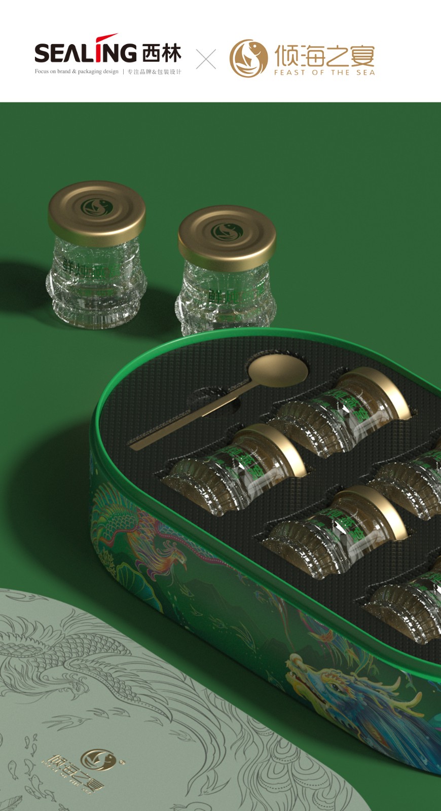 近兩年來,西林設(shè)計(jì)為傾海之宴打造的“傾海龍”超級符號,被廣泛應(yīng)用在視覺傳播的種個(gè)節(jié)點(diǎn)上,從產(chǎn)品包裝、宣傳物料、展會、新品發(fā)布會等等,形成了良好的視覺印象,也是傾海之宴禮盒包裝設(shè)計(jì)的核心元素,它不僅具有強(qiáng)烈的視覺沖擊力,還承載著深厚的文化內(nèi)涵。在設(shè)計(jì)中,龍成為了這一符號的代表,這一選擇并非偶然。龍,作為中國傳統(tǒng)文化的象征,代表著力量、尊貴與吉祥,中華人都是龍的傳人。在包裝上使用龍作為超級符號,能夠迅速吸引消費(fèi)者的眼球,并在情感上產(chǎn)生共鳴。這種情感鏈接有助于增強(qiáng)消費(fèi)者對產(chǎn)品的好感,從而提高產(chǎn)品的附加值和市場競爭力。