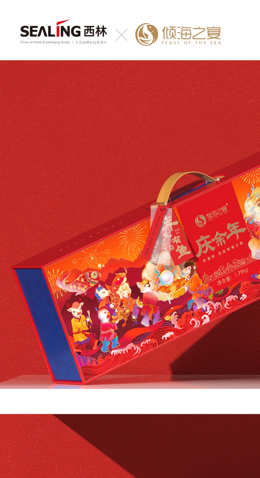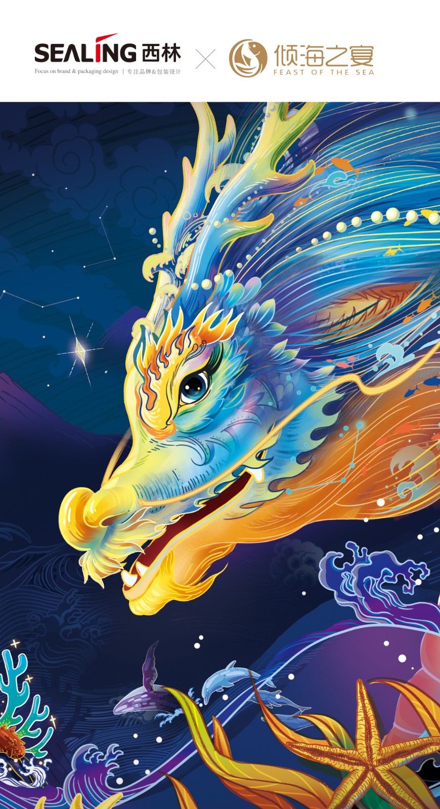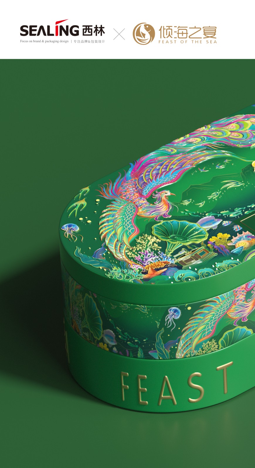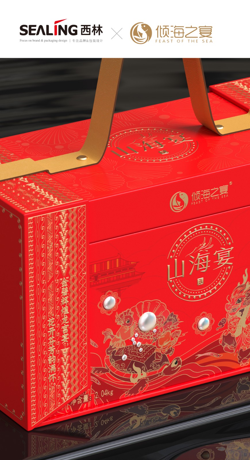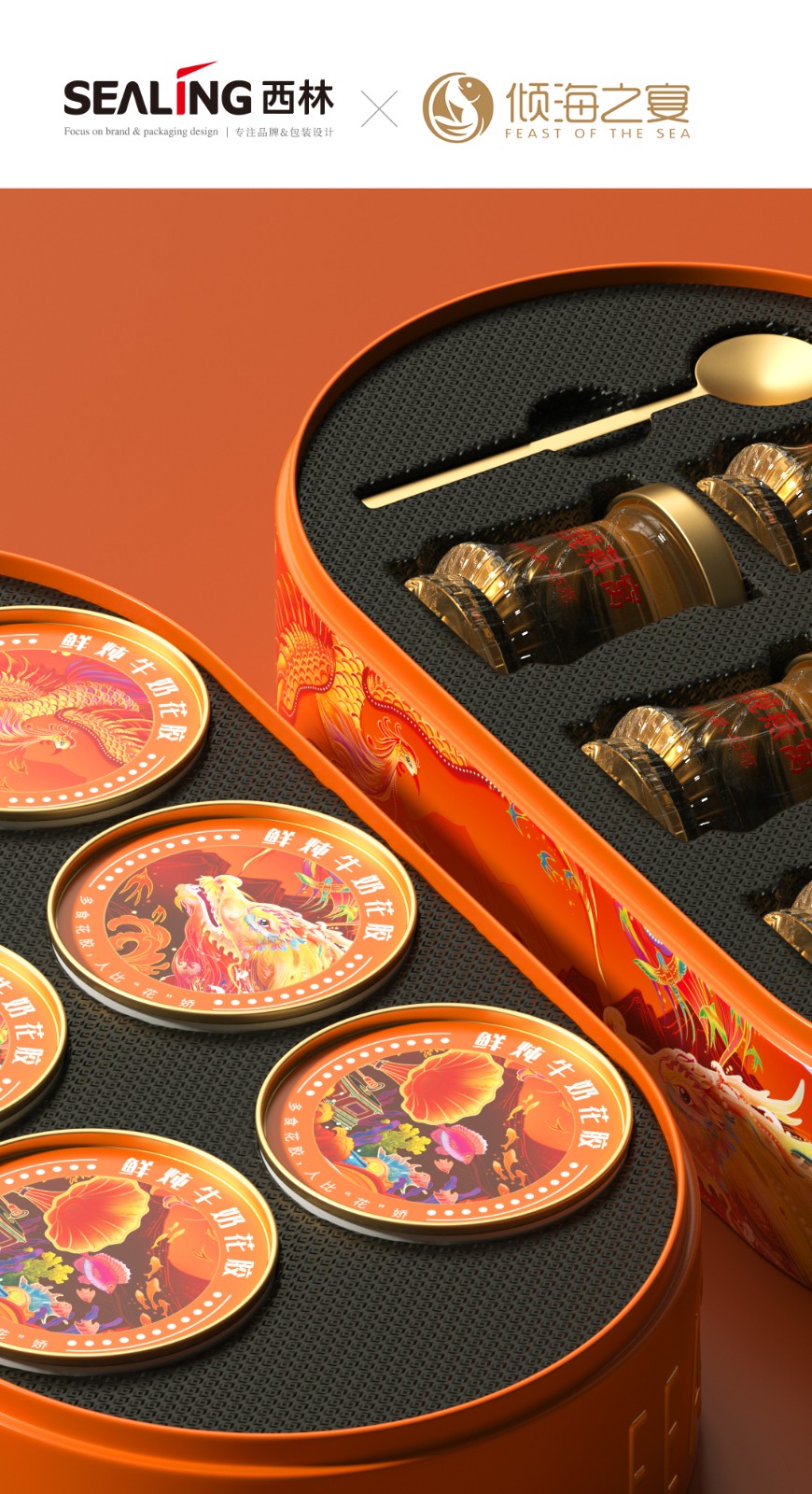 近兩年來,西林設(shè)計(jì)為傾海之宴打造的“傾海龍”超級符號,被廣泛應(yīng)用在視覺傳播的種個(gè)節(jié)點(diǎn)上,從產(chǎn)品包裝、宣傳物料、展會、新品發(fā)布會等等,形成了良好的視覺印象,也是傾海之宴禮盒包裝設(shè)計(jì)的核心元素,它不僅具有強(qiáng)烈的視覺沖擊力,還承載著深厚的文化內(nèi)涵。在設(shè)計(jì)中,龍成為了這一符號的代表,這一選擇并非偶然。龍,作為中國傳統(tǒng)文化的象征,代表著力量、尊貴與吉祥,中華人都是龍的傳人。在包裝上使用龍作為超級符號,能夠迅速吸引消費(fèi)者的眼球,并在情感上產(chǎn)生共鳴。這種情感鏈接有助于增強(qiáng)消費(fèi)者對產(chǎn)品的好感,從而提高產(chǎn)品的附加值和市場競爭力。