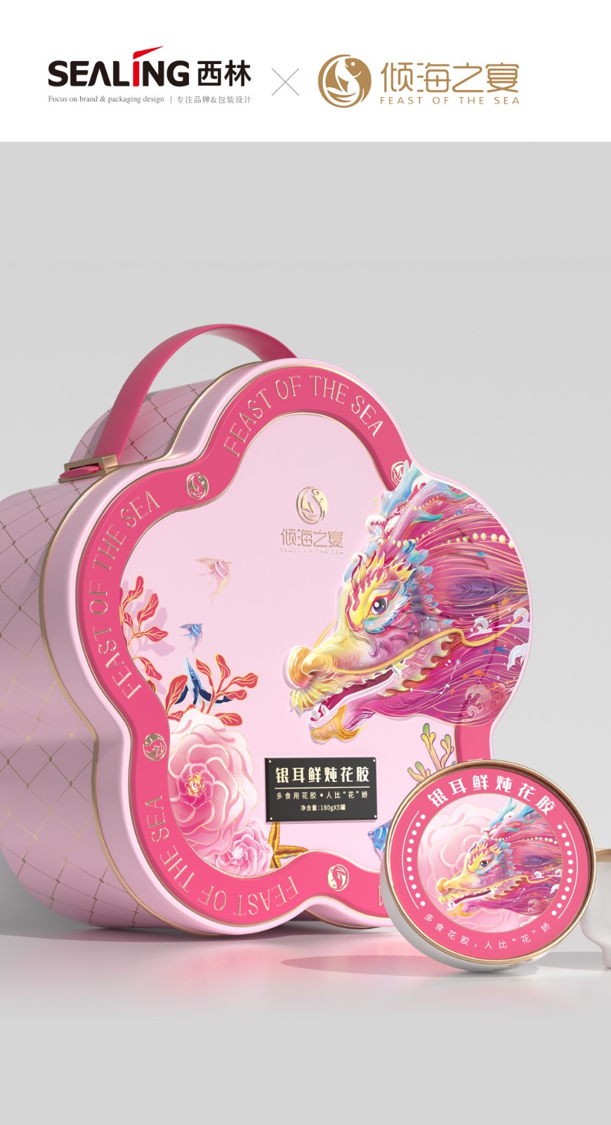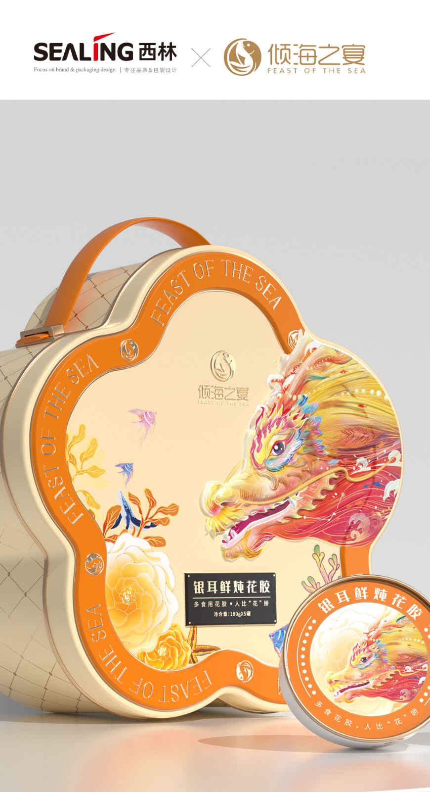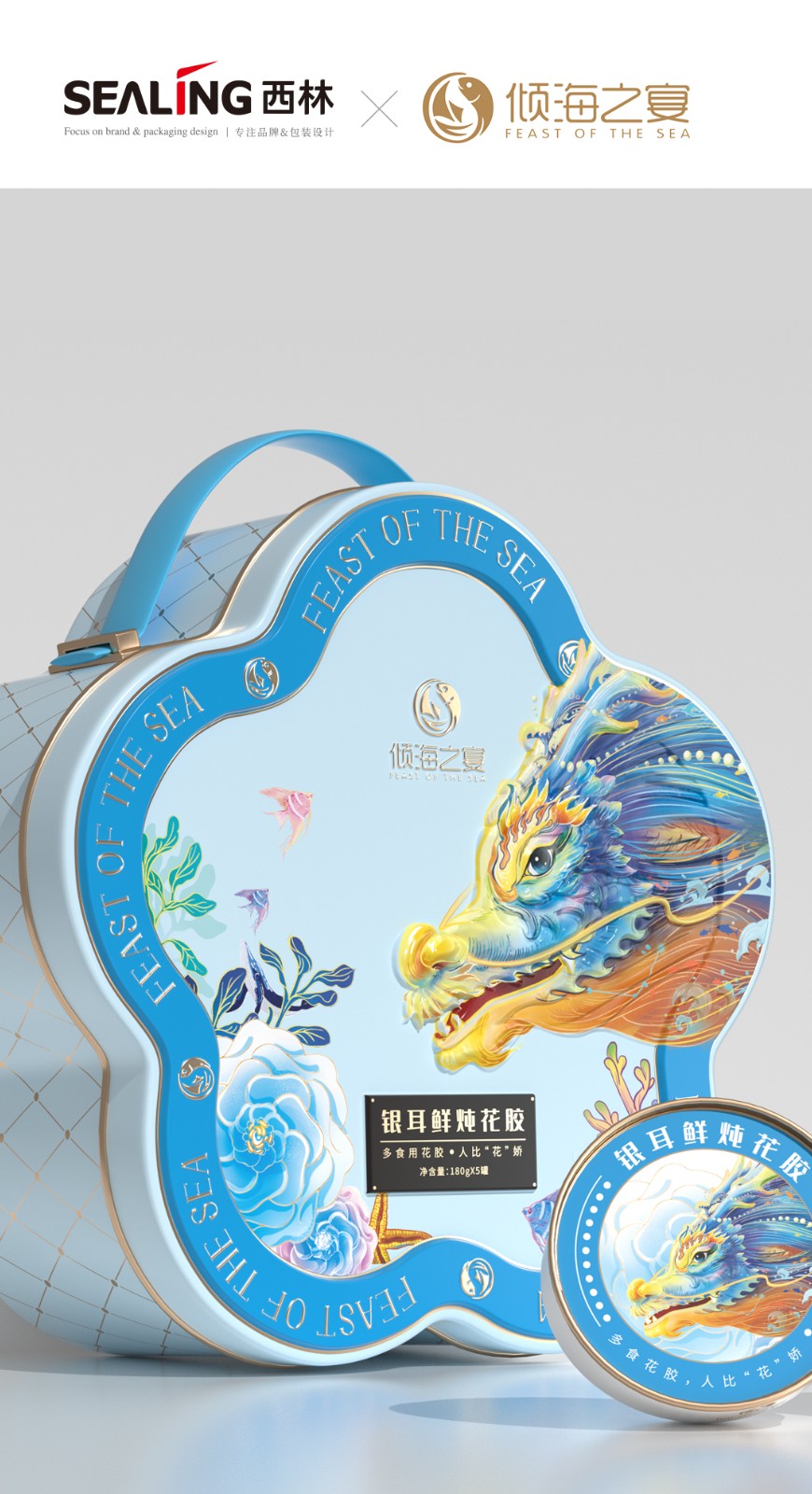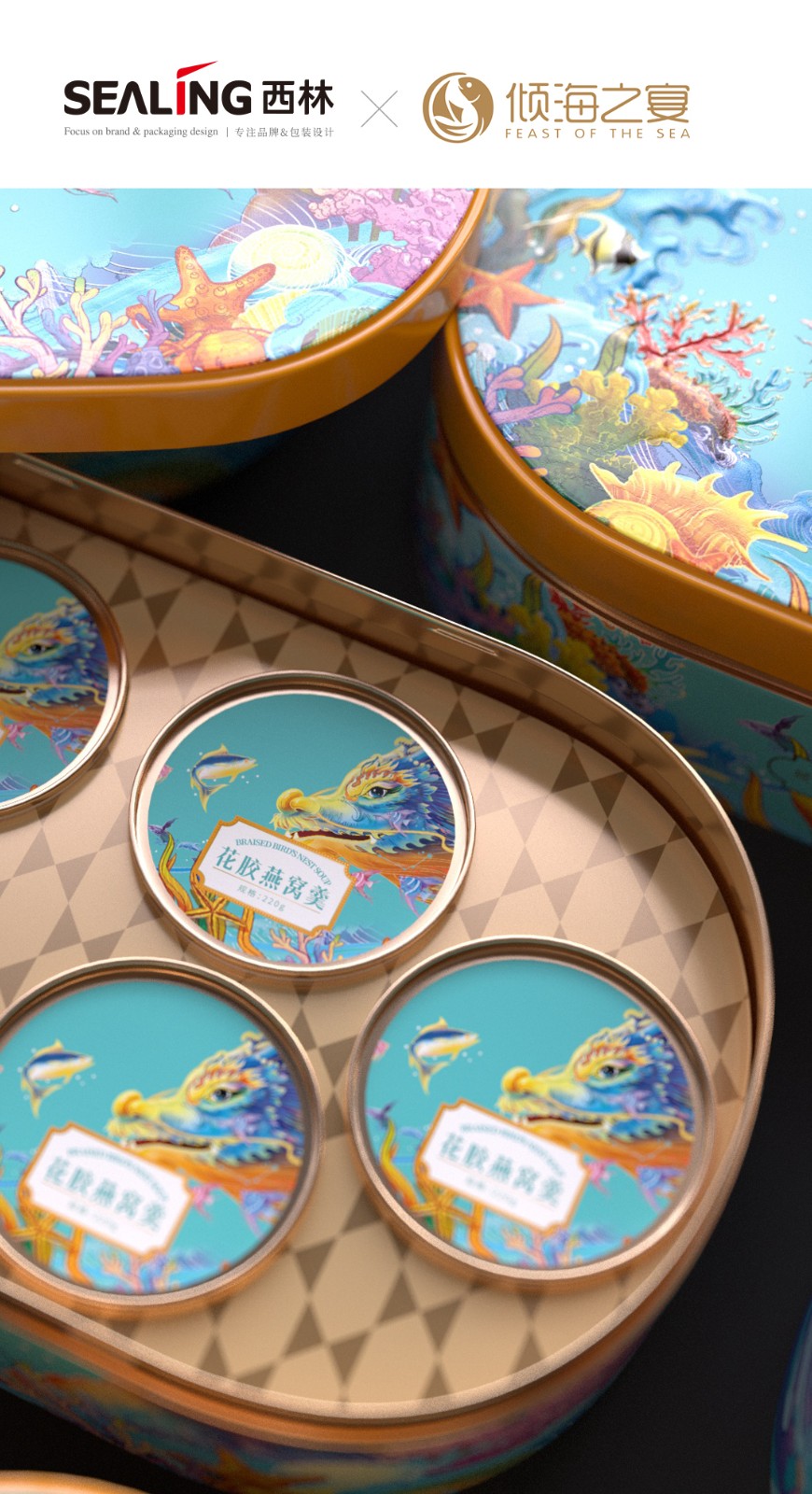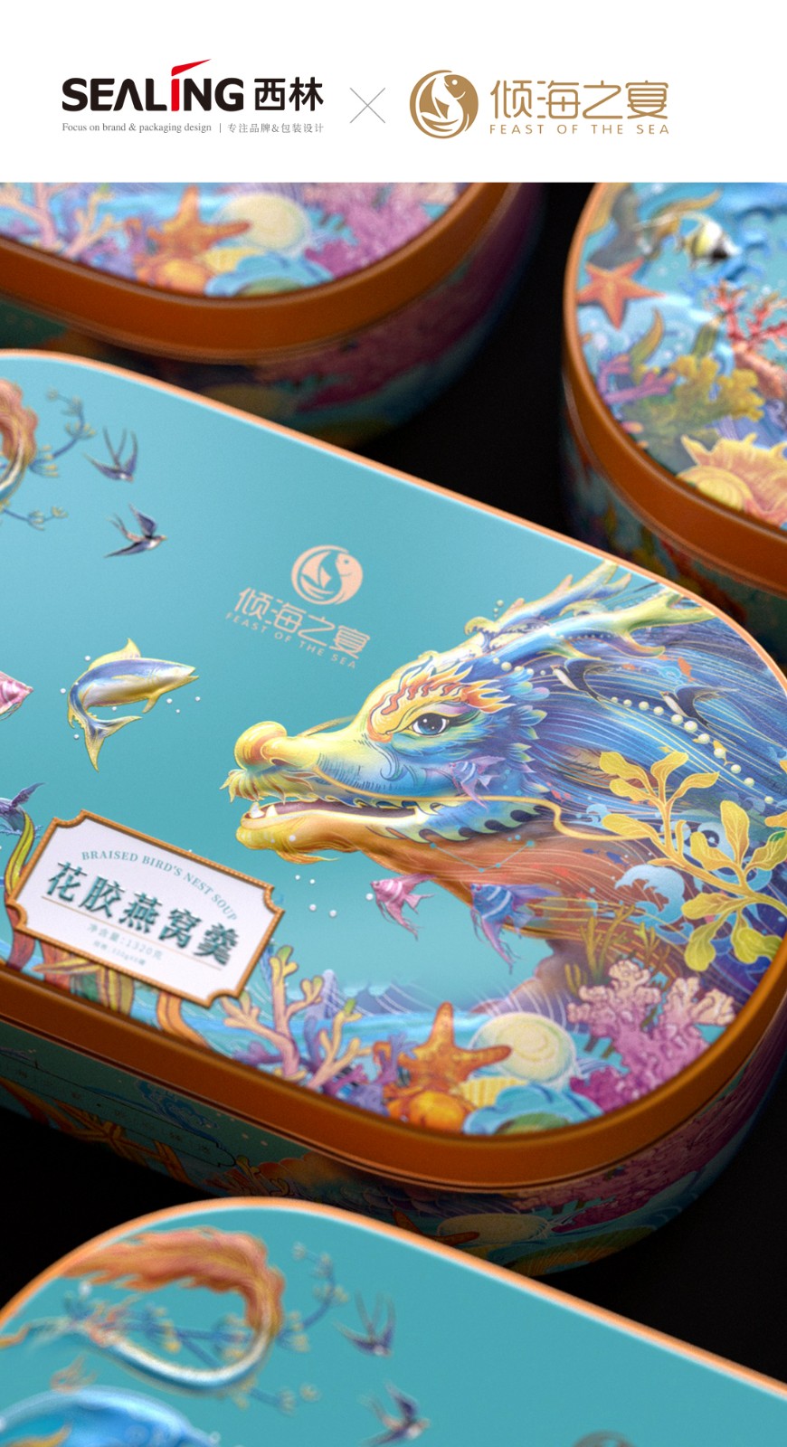 龍年來臨之際,西林設(shè)計(jì)助力傾海之宴品牌推出了全新的禮盒,包裝設(shè)計(jì)設(shè)計(jì)融入了濃厚的龍年元素和吉祥寓意,完美地展現(xiàn)了東方的美學(xué)理念,將禮盒的檔次提升到了一個(gè)新的高度。燕窩花膠奢養(yǎng)禮盒的包裝設(shè)計(jì)旨在展現(xiàn)產(chǎn)品的尊貴品質(zhì),同時(shí)融入了中國傳統(tǒng)文化元素和海洋生態(tài)元素,呈現(xiàn)出精致、創(chuàng)意和奢華的風(fēng)格。西林設(shè)計(jì)為這款禮盒采用高品質(zhì)的馬口鐵盒作為外包裝,具有堅(jiān)固、耐用的特點(diǎn),能夠有效地保護(hù)內(nèi)部產(chǎn)品。馬口鐵盒的外觀采用質(zhì)感多色系列,給人一種時(shí)尚、高貴、典雅的感覺。