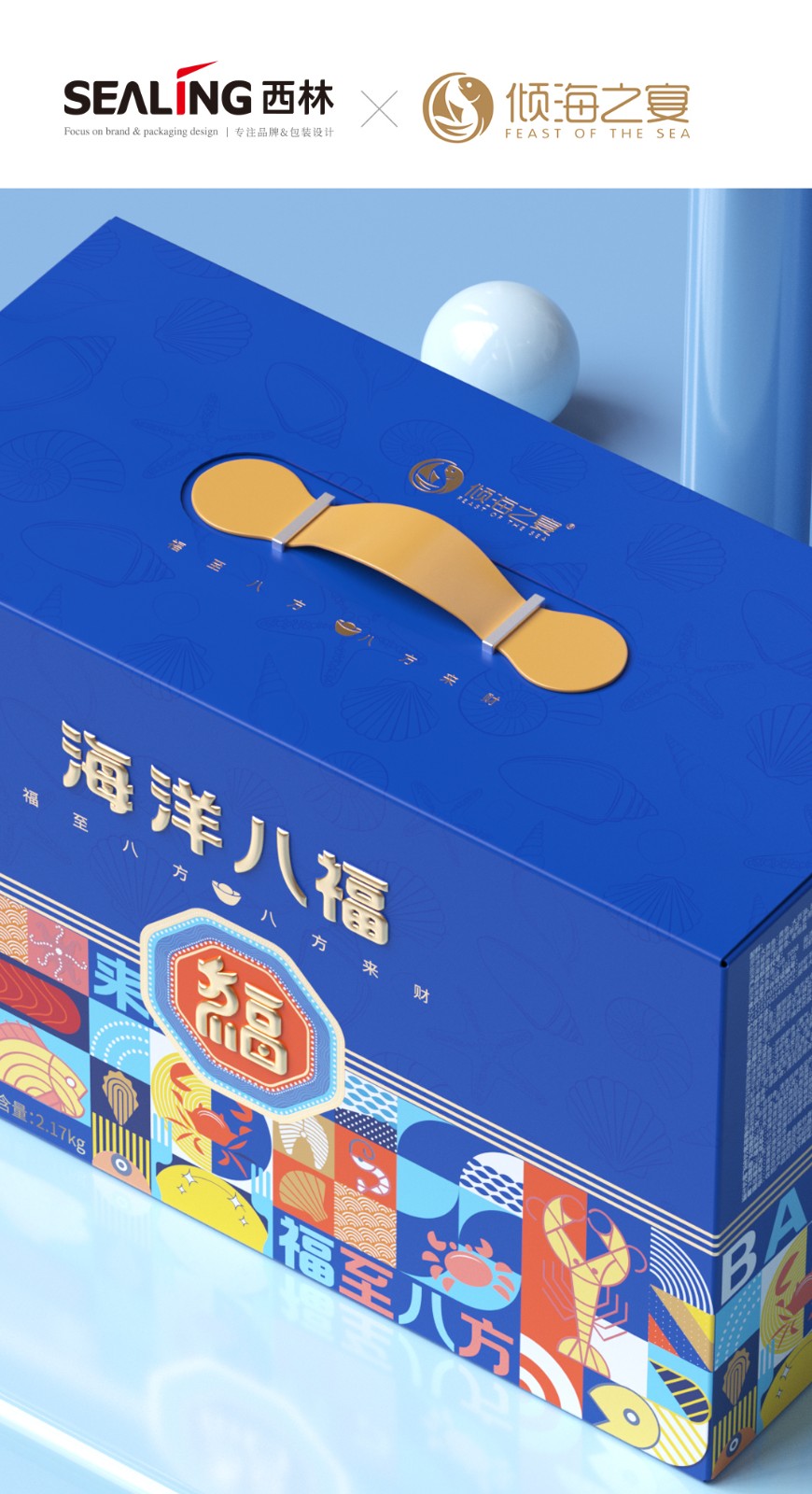 海洋八福禮盒的設(shè)計(jì)靈感來源于海洋的神秘與廣闊,以及中國傳統(tǒng)文化中對“?!钡莫?dú)特理解。我們希望通過現(xiàn)代的設(shè)計(jì)語言,將傳統(tǒng)與時(shí)尚元素融合,創(chuàng)造出既具有文化底蘊(yùn),又充滿現(xiàn)代感的包裝設(shè)計(jì)。禮盒采用長方體結(jié)構(gòu),簡潔大方。盒面采用藍(lán)色,象征海洋的廣闊與深邃。品名采用金色起鼓燙金工藝,增添禮盒的華麗感。外盒采用環(huán)保紙板制作,表面覆以防水膜,確保禮盒耐用且易于清潔。盒蓋上側(cè)印有祝福語,為消費(fèi)者帶來溫馨的祝福。手提禮盒,方便攜帶,禮盒上印有精致的品牌標(biāo)志,提升整體品牌形象。