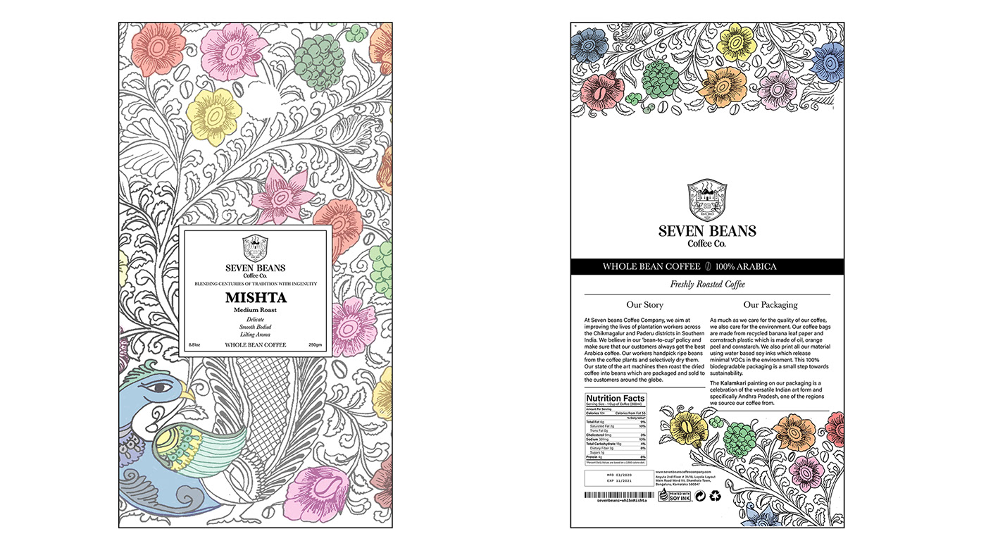 當(dāng)下很多咖啡包裝由鋁、聚乙烯和錫組成,這些都是不可生物降解的。在這個(gè)項(xiàng)目中,設(shè)計(jì)師致力于開發(fā)Seven Beans咖啡公司的品牌標(biāo)識(shí),以及他們使用生物可降解材料包裝阿拉比卡咖啡豆。包裝設(shè)計(jì)師用再生香蕉葉紙做外包裝,用玉米淀粉塑料(由玉米油、橘皮和玉米淀粉制成的可生物降解塑料)做咖啡袋的內(nèi)層。該項(xiàng)目的另一個(gè)目標(biāo)是通過在包裝上整合不同風(fēng)格的印度傳統(tǒng)藝術(shù)形式來支持印度本土藝術(shù)家。這將提高人們對(duì)各種藝術(shù)形式的認(rèn)識(shí)和興趣(因?yàn)檫@種咖啡也是出口的)。