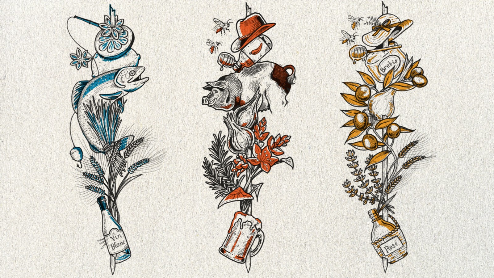 這些盒子分布在葡萄酒商店和熟食店,采用三種傳統(tǒng)設計(魚,肉和蔬菜)來象征當?shù)?。三個圖案,三個精美插圖和“好心情”顏色編碼清晰地呈現(xiàn)了每個設計和每個互補的風味。