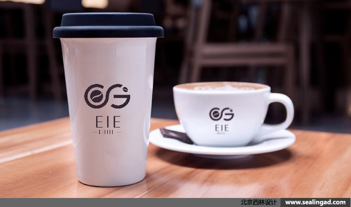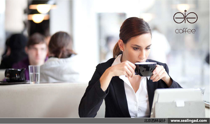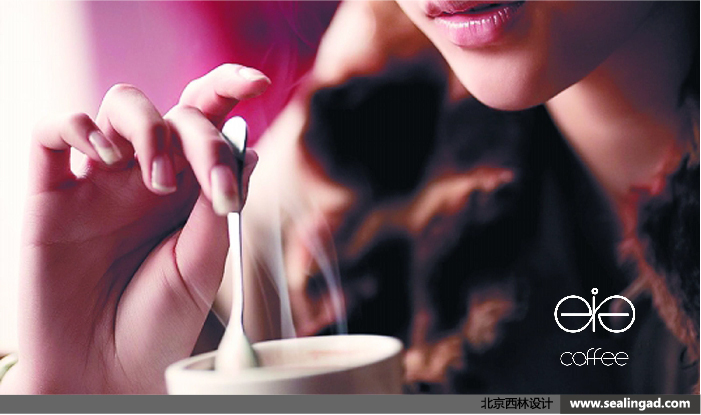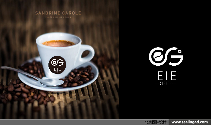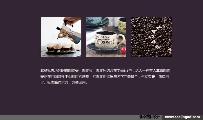 通過(guò)一正一倒的兩個(gè)形似咖啡豆的e字,意在美味與他人共分享,中間的i字?jǐn)M人化,寓意我的咖啡。