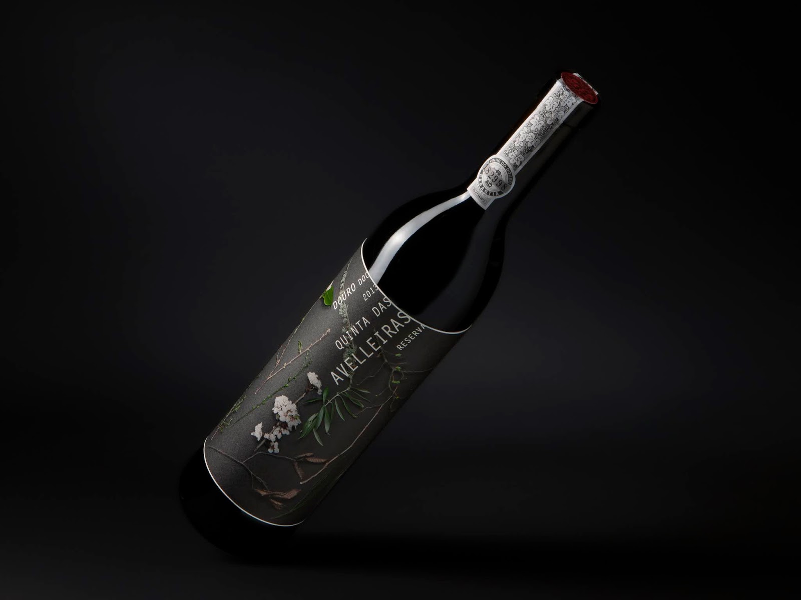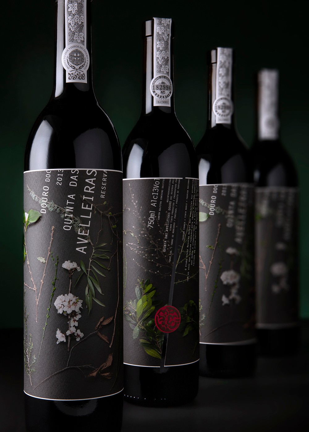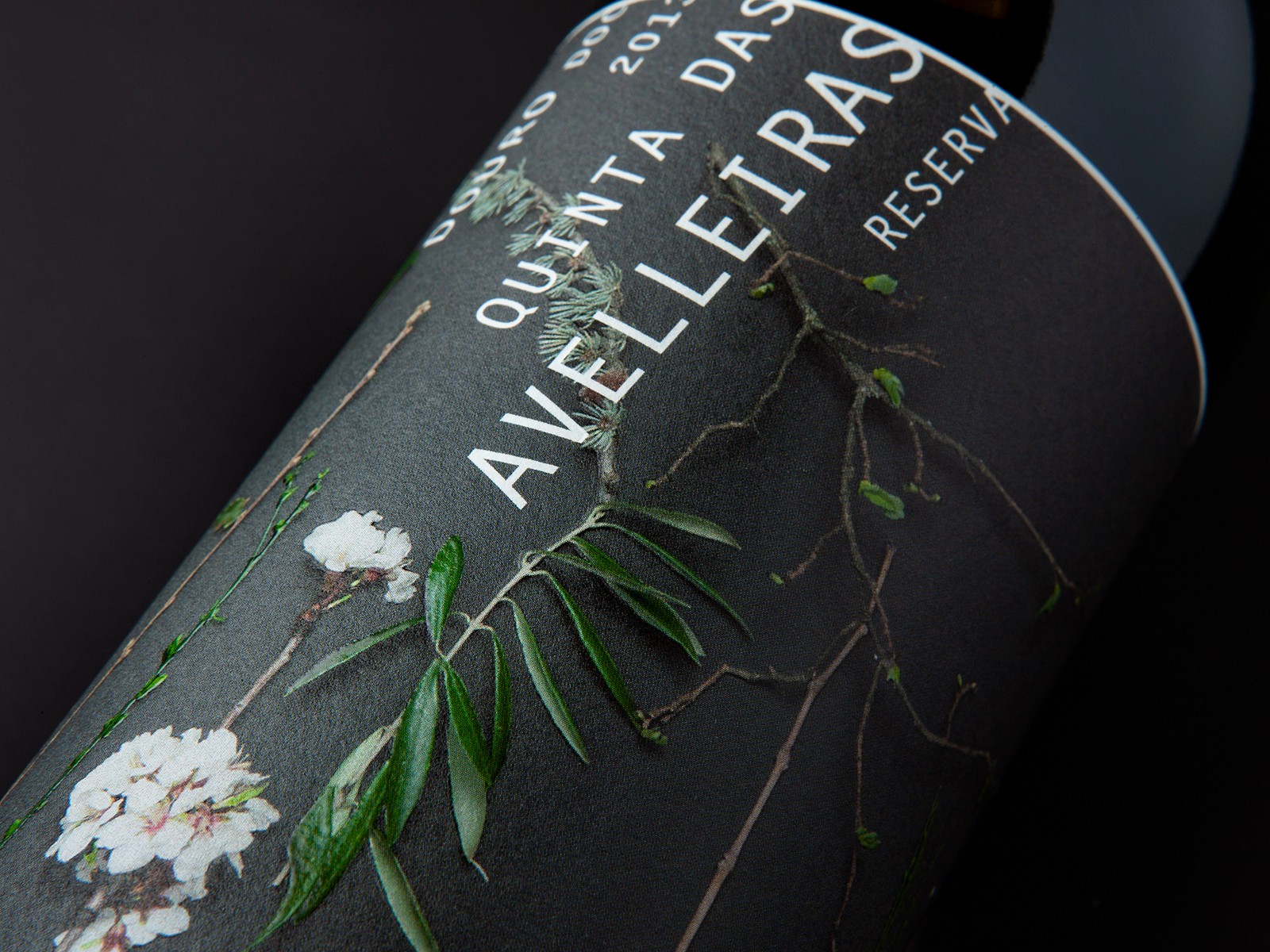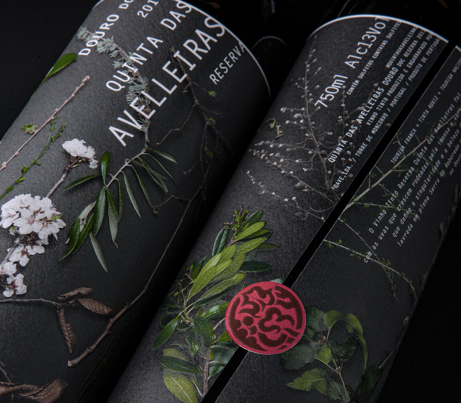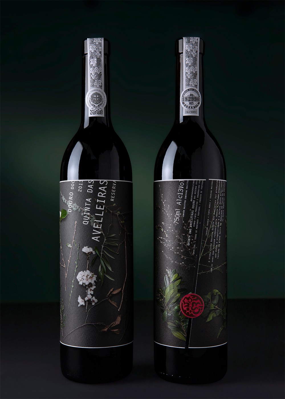 與標簽的傾斜切口的角度平行設(shè)置的傾斜文本從上帶向下流到下帶,從而創(chuàng)建了一個框架,使圖形元素可以呼吸。圖紙的嚴格程度,膠版印刷(CMYK),面漆的應用-保留的啞光清漆和高浮雕-以及紙張的選擇(Arconvert Cotone Bianco)都產(chǎn)生了標簽,可以通過增加價值來提高產(chǎn)品質(zhì)量到Quinta das Avelleiras Reserva Douro包裝。