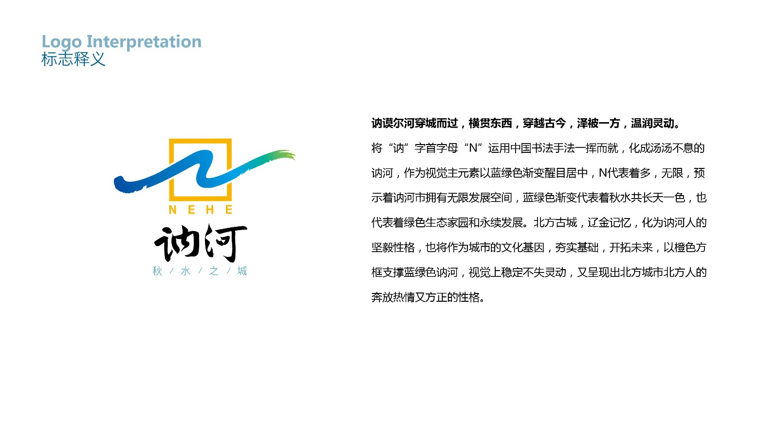 訥河城市品牌形象設(shè)計(jì)創(chuàng)意釋義:訥謨爾河穿越而過,橫貫東西,穿越古今,澤被一方,溫潤靈動。我們將“訥”字首字母[N]運(yùn)用中國書法手法一揮而就,化成湯湯不息的訥河,作為視覺主元素以藍(lán)綠色漸變醒目居中,N代表著多,無限,預(yù)示著訥河擁有無限發(fā)展空間,藍(lán)綠色漸變代表著秋水共長天一色,也代表著綠色生態(tài)家園和永續(xù)發(fā)展。北方古城,遼金記憶,化為訥河人的堅(jiān)毅性格,也將作為城市的文化基因,夯實(shí)基礎(chǔ),開拓未來,以橙色方框支撐藍(lán)綠色訥河,視覺上穩(wěn)定不失靈動,又呈現(xiàn)出北方城市北方人的奔放熱情又方正的性格。