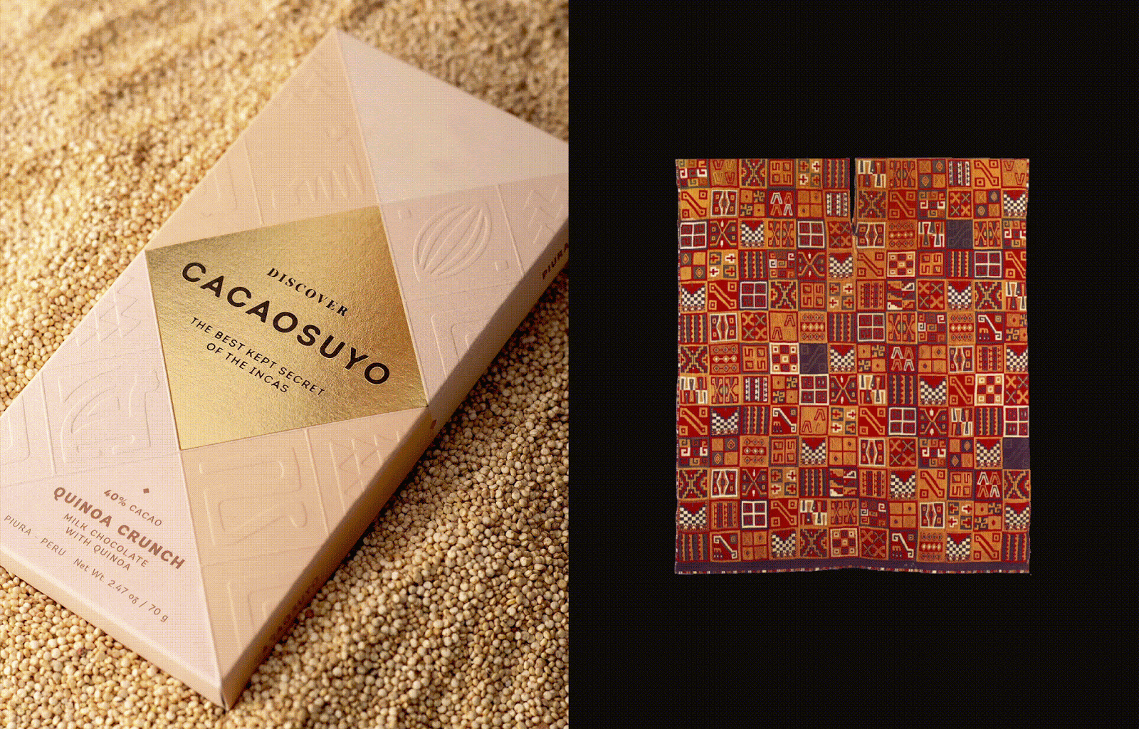 Cacaosuyo必須與該品牌的主張一致:“印加人的最佳機(jī)密”,因?yàn)樵谝曈X層面上,其內(nèi)容的價(jià)值尚未傳播。該品牌已經(jīng)有一個(gè)以tocapus(印加人的圖形通信系統(tǒng))為靈感的幾何系統(tǒng),我們決定維持此比例,但要更改其比例。此外,我們添加了代表安第斯三部曲(禿鷹,美洲獅和蛇)的圖標(biāo)系統(tǒng)。這樣,我們可以使品牌煥然一新,但保留其本質(zhì)。新包裝必須被視為真正的寶藏,這就是為什么我們給包含該品牌的鉆石賦予“金”質(zhì),而其余包裝就像織布機(jī)一樣,因此我們?cè)O(shè)法使它像博物館一樣。