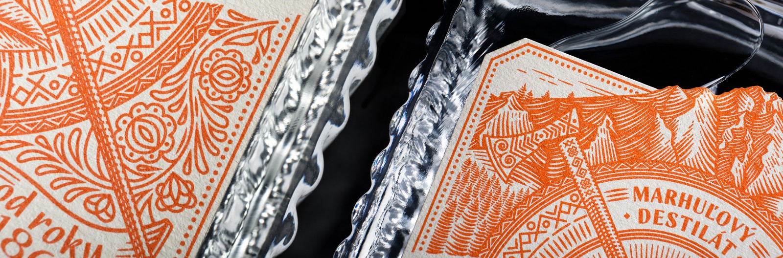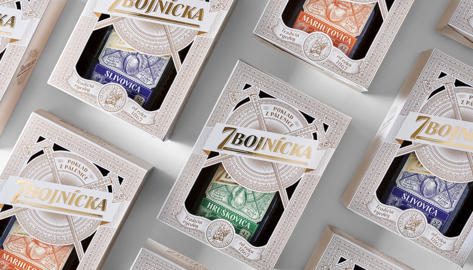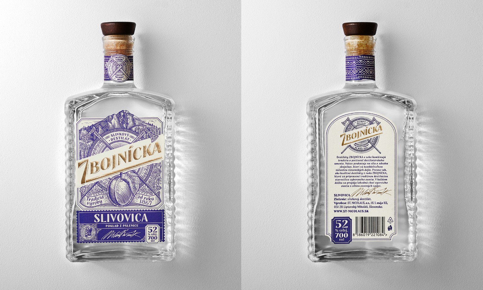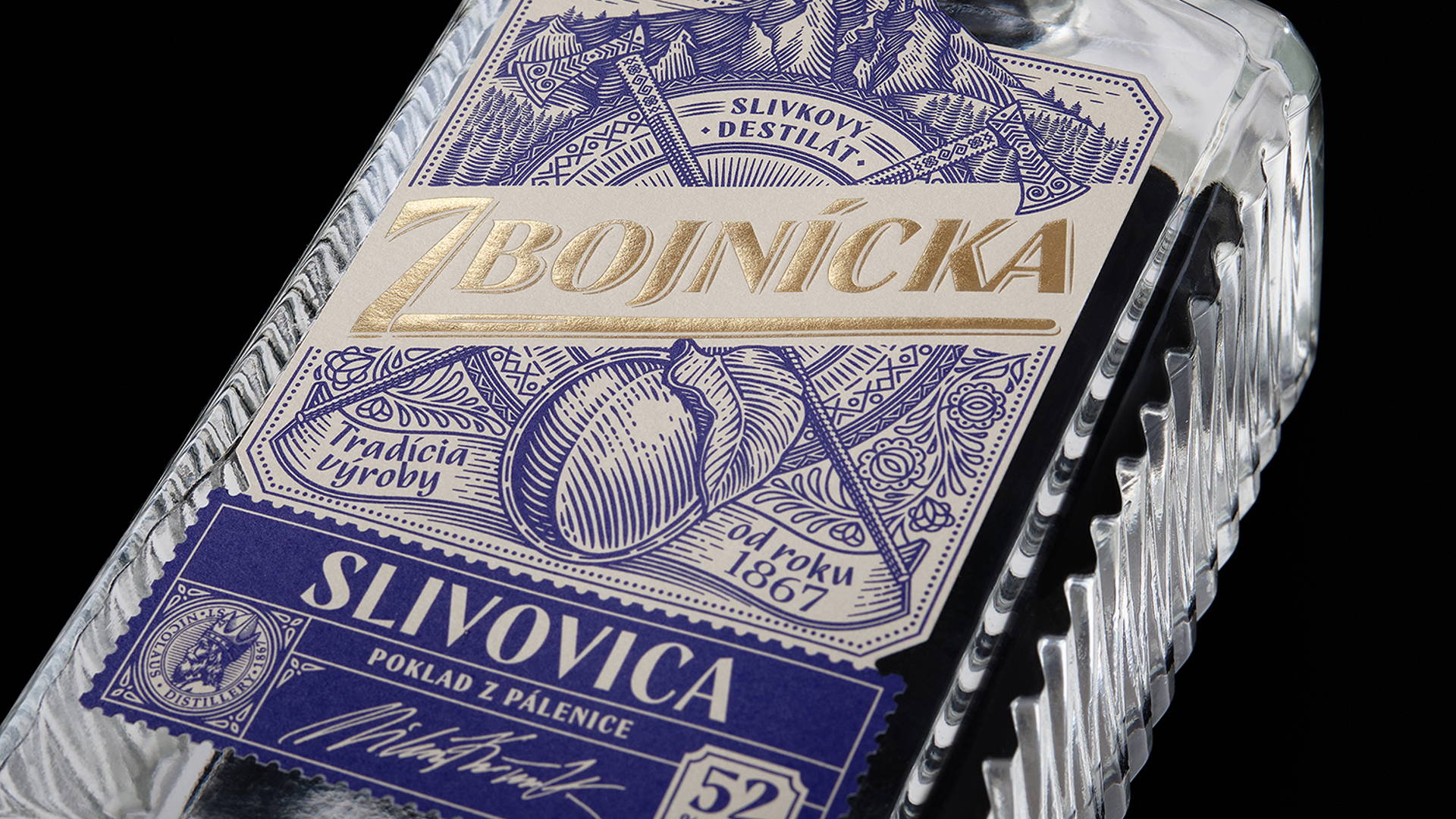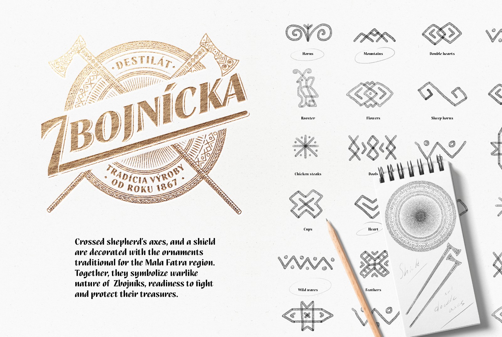 我們選擇了質(zhì)地柔軟的冰霜紙,以喚起一種天然的、自制的產(chǎn)品的感覺。雕刻風格的插圖創(chuàng)造了一種被轉(zhuǎn)移到過去的印象。Zbojníks使用的十字牧羊人斧頭和一個飾以Mala Fatra地區(qū)傳統(tǒng)裝飾品的盾牌被放置在標簽的中央。它們共同象征著Zbojníks人的特征--他們好戰(zhàn)的本性,愿意戰(zhàn)斗和保護他們的珍寶。標簽的頂部是著名的韋爾克羅祖特克山的雕刻插圖,根據(jù)傳說,這里藏有許多珍寶。這種來自不同地區(qū)的斯洛伐克裝飾品的組合,增強了一個真正的本地,傳統(tǒng)產(chǎn)品的形象。