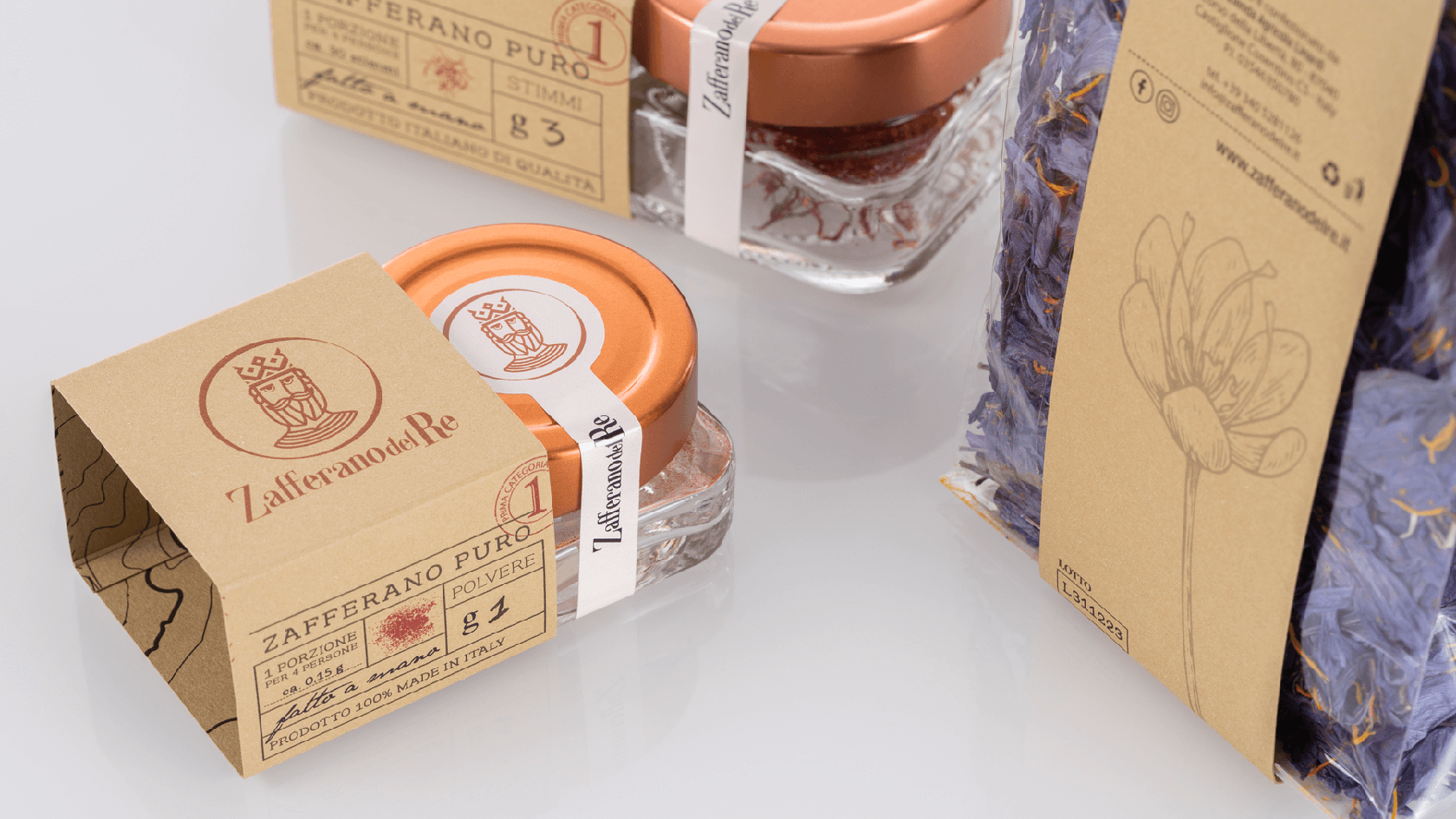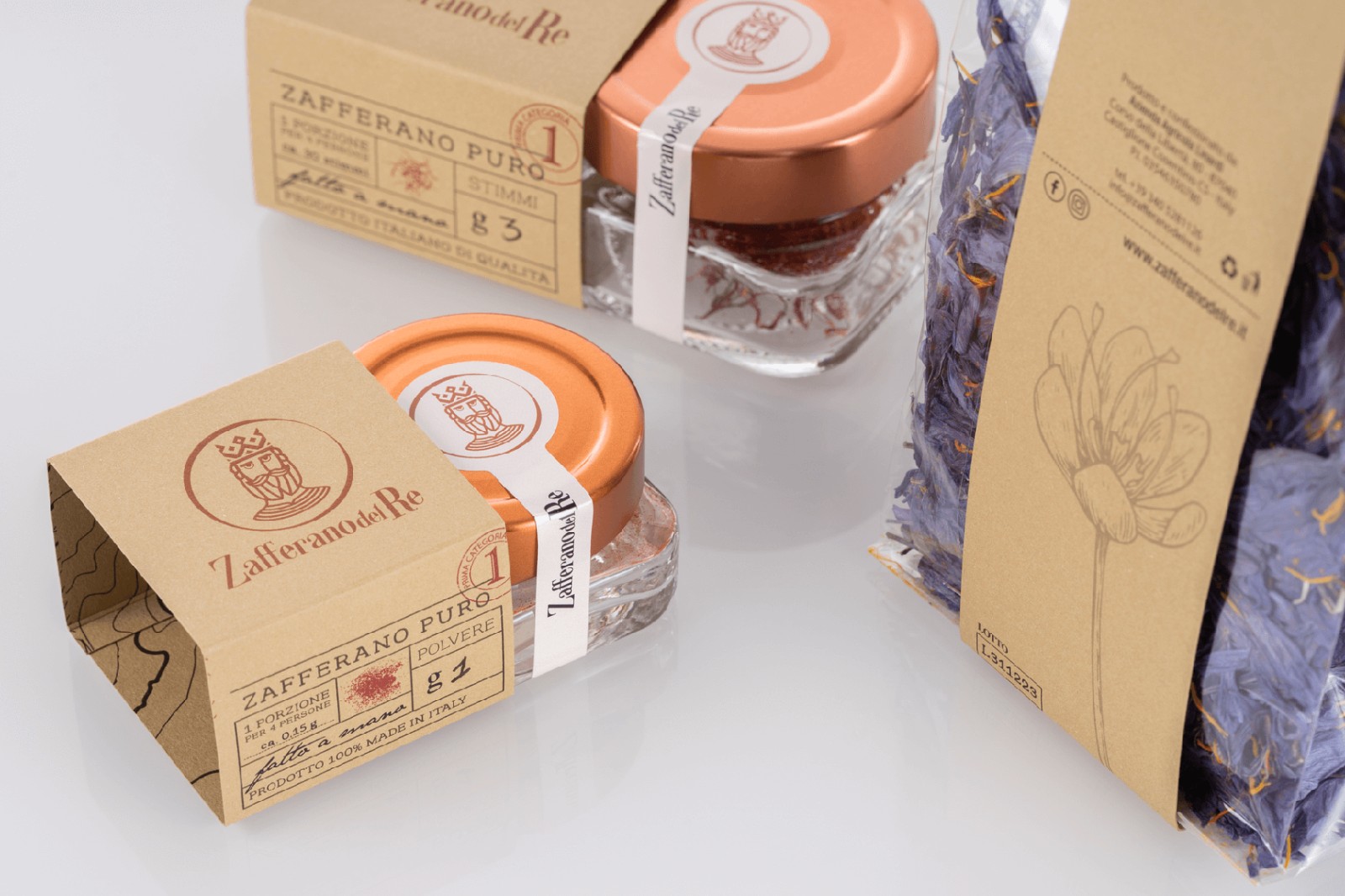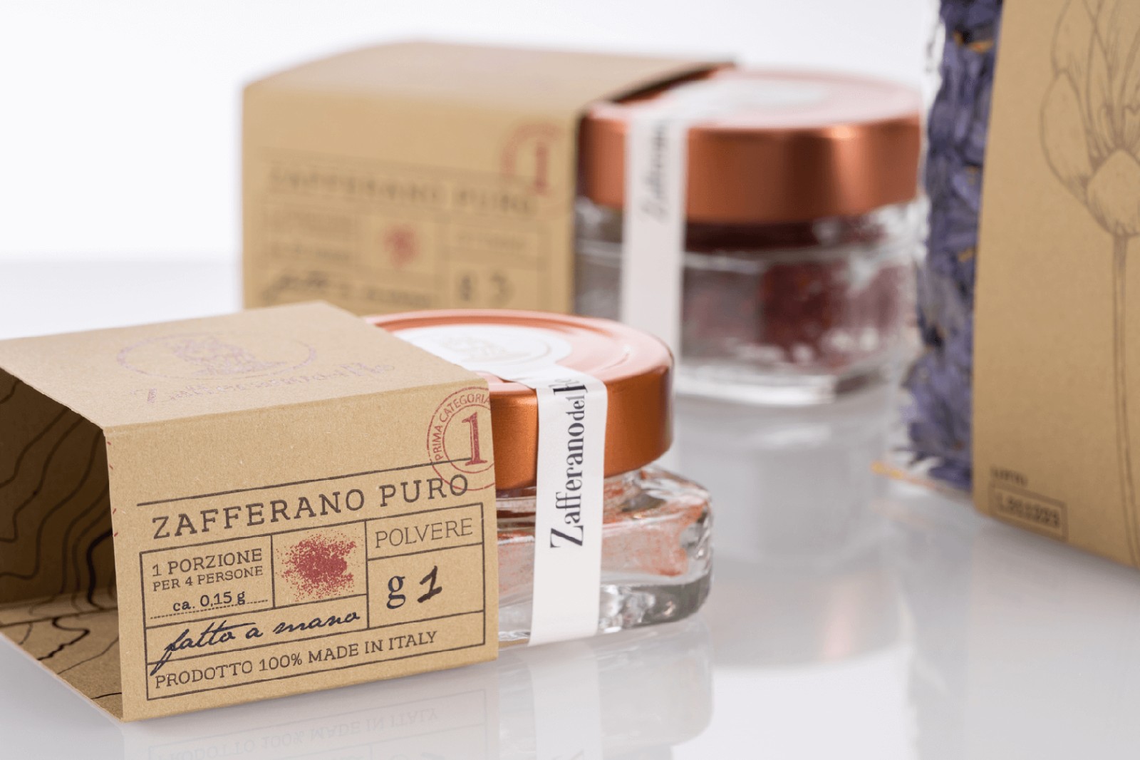 像國王寶藏中的黃金那樣的貴重產(chǎn)品,以純藏紅花的形式分布在柱頭和粉末中,像食用花卉一樣干燥,加到蜂蜜中成為原始的Smielace,與面粉混合后變成L'oro del Busento。每個包裝都是用手封閉的,即使是單劑量包裝的密封圈也帶有紅色螺紋接縫。每包中都包含一張藏寶圖,以強調(diào)藏紅花的概念:藏寶。