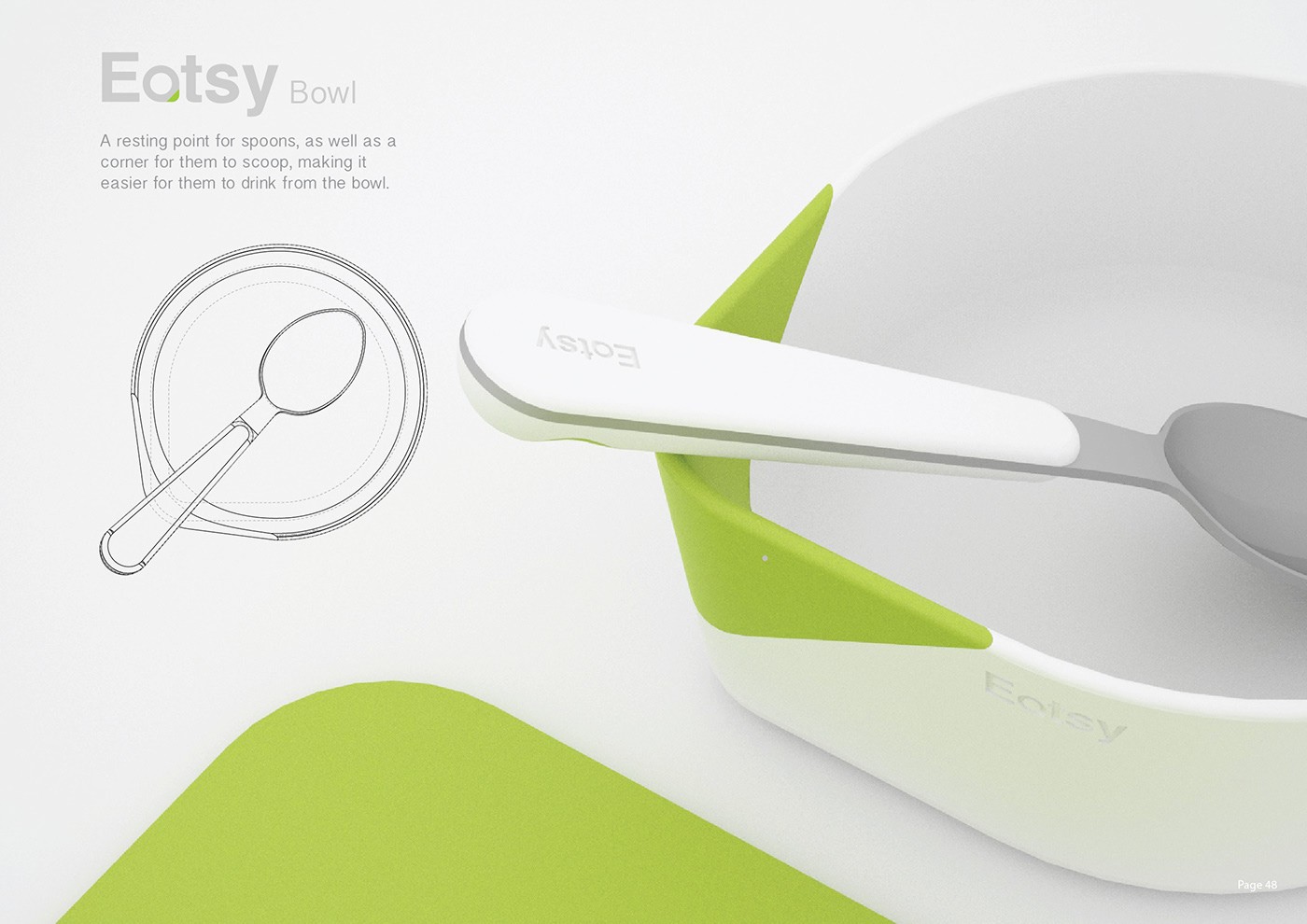 Eatsy 盤子的特點(diǎn)是有一個凸起的角落和斜坡來夾住食物。盤子的曲率作為引導(dǎo),將勺子引導(dǎo)到角落進(jìn)行舀。角落也可以作為飲用和傾倒的地方。