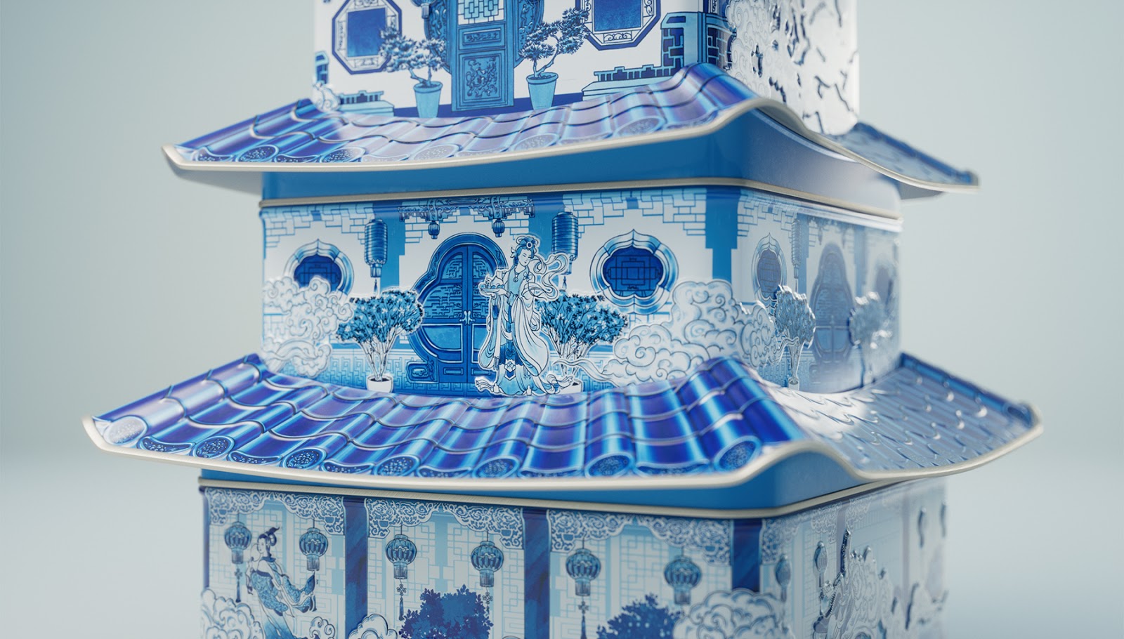傳統(tǒng)的青花國風為設計風格,一個有創(chuàng)意的鐵盒,使他賦予靈魂,設計點在于層疊設計與天宮的寓意